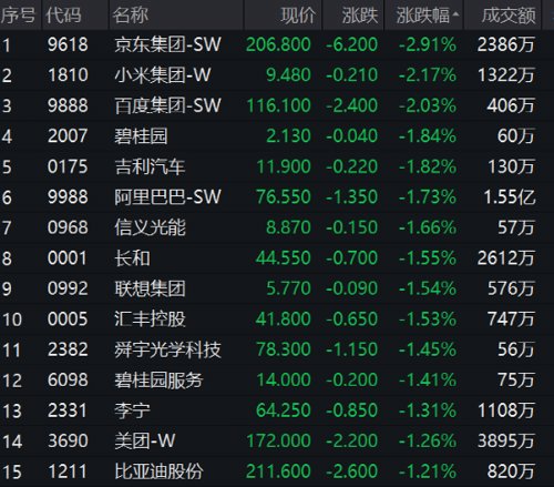 科技、新能源汽车股跌幅居前,京东跌近3%领跌蓝筹,小米,百度跌超2%;吉利汽车、比亚迪跌幅居前。