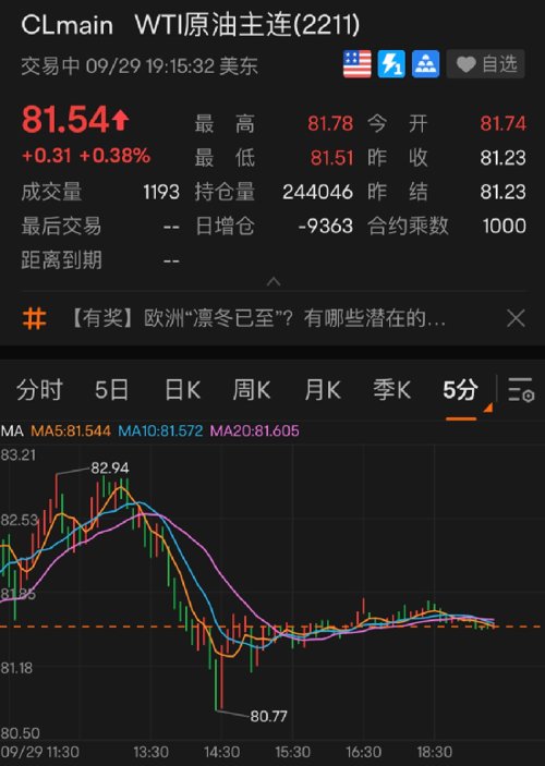 盘前上涨的原油期货在美股盘中转跌,美国WTI原油盘前涨至82.94美元、日内涨近1%,布伦特11月原油期货涨至90.12美元,日内涨近0.9%。最终,WTI 11月原油期货收跌1.12%,报81.23美元/桶,目前位于81.57美元/桶附近。布伦特11月原油期货收跌0.93%,报88.49美元/桶。
