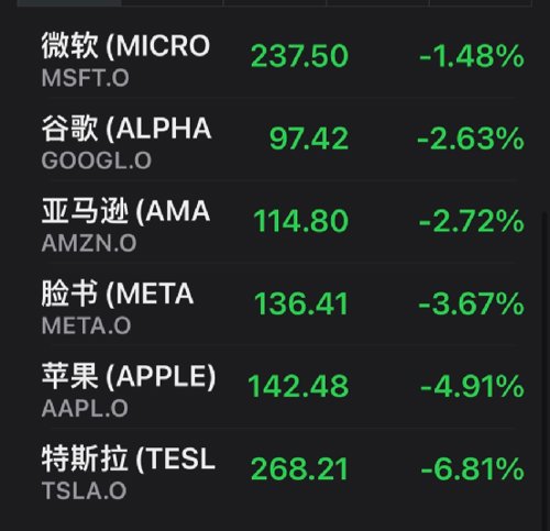 龙头科技股全线下跌,亚马逊(AMZN)跌2.72%,奈飞(NFLX)跌2.24%,谷歌(GOOGL)跌2.63%,脸书(META)跌3.67%,微软(MSFT)跌1.48%。