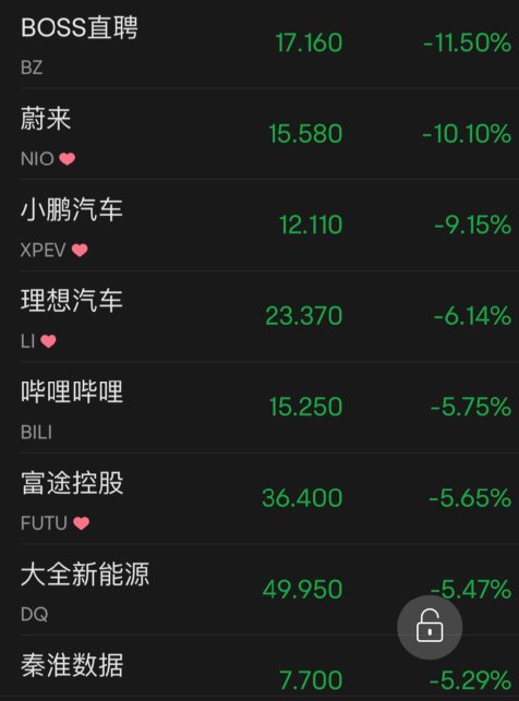 热门中概股追随大盘回落,阿里巴巴跌2.38%,京东跌3.17%,拼多多跌3.51%,哔哩哔哩跌5.75%,百度跌3.03%,新东方跌0.08%,网易跌3.68%,腾讯音乐跌3.37%,爱奇艺跌4.15%,满帮跌4.53%,每日优鲜跌18.10%。新能源汽车中,蔚来汽车跌10.10%,小鹏汽车跌9.15%,理想汽车跌6.14%,