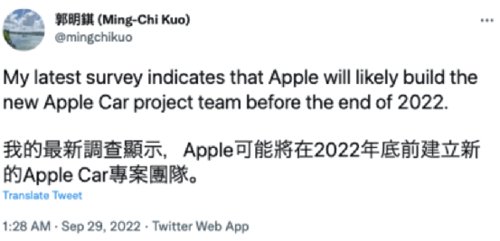 知名苹果分析师郭明錤在社交平台发文公布了自己最新的调查,苹果可能将在2022年底建立新的Apple Car专业团队。