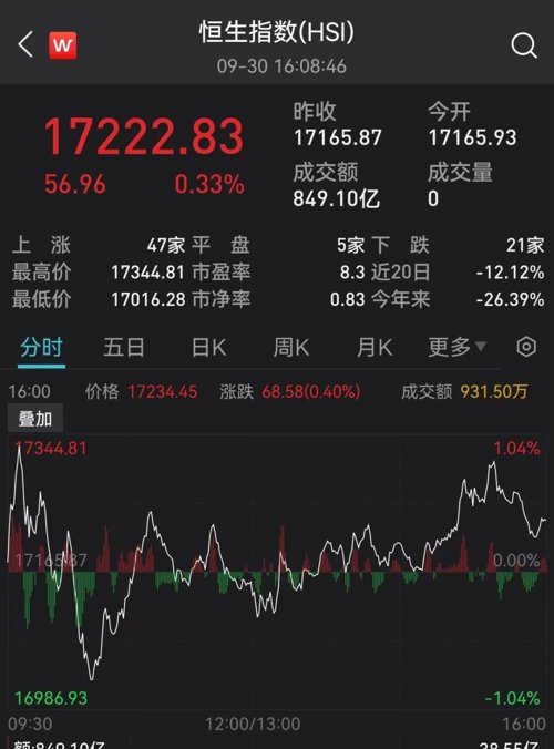 9月30日恒生指数盘中低至17016,险破17000点大关,股指尾盘上扬收红于17222点,涨0.33%,今年累计跌幅约26%。