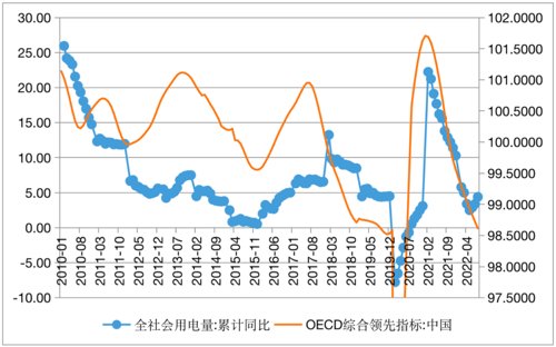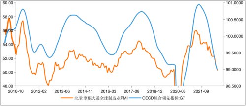 从全球重要经济体的经济周期来看,这一轮经济的高点可能是在2021年7月份左右,OECD综合领先指数在2021年7月份达到了高点,然后一路回落,反映了全球经济增长预期逐渐放缓,而且OECD综合领先指标的走势也和摩根大通全球制造业PMI的走势遥相呼应、相互印证。