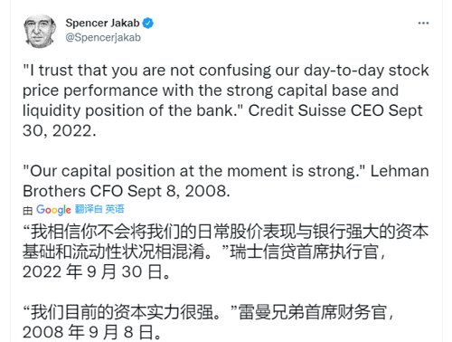 瑞信行政总裁科尔纳在数周内第二份发送给员工的备忘录中,承认银行内部和外部存在很多不确定性和猜测,但呼吁员工不要将日常股价表现与公司「强大的资本基础和流动性状况」混为一谈。不过这一句话,雷曼兄弟当年破产前也说过类似的。