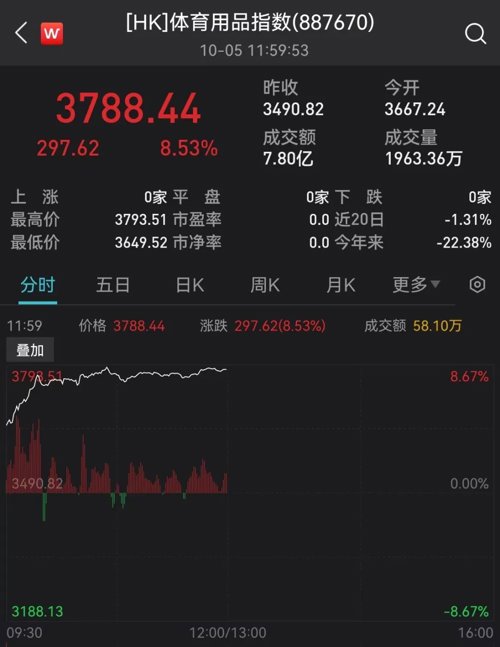 5日早盘,体育用品板块成为仅次于新能源汽车涨幅的板块,板块上涨超8%。