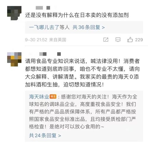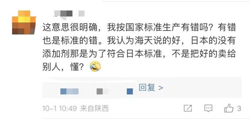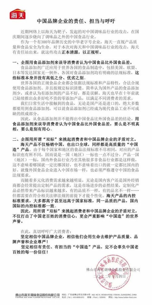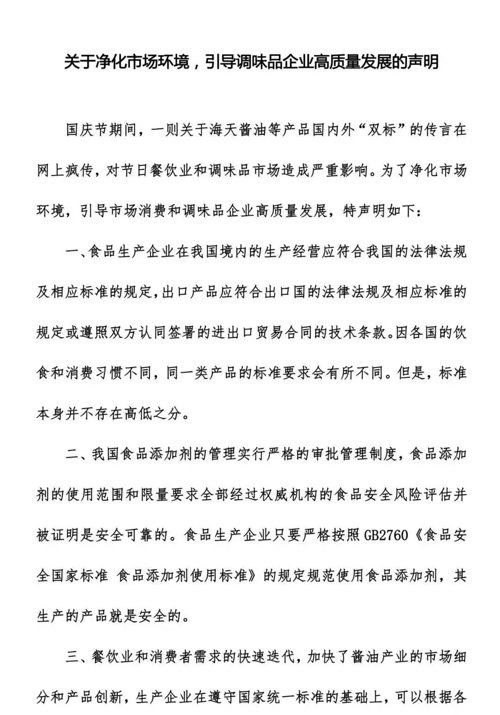 10月5日,海天味业发布声明称,食品添加剂广泛应用于各国的食品制造中,各企业按照各国标准和产品特性合法合规使用食品添加剂,海天售卖的国内国外产品内控标准是一致的,并未“双标”。