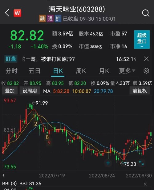 截至9月30日,海天味业股价82.82元,最新市值3838亿元。