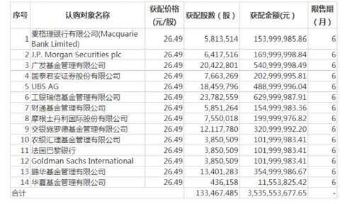 QFII机构UBS AG(瑞银集团)获配1845.98万股,获配金额达4.89亿元;摩根士丹利获配2亿元,J.P. Morgan Securities plc(摩根大通证券)获配1.7亿元,麦格理银行获配金额1.54亿元,法国巴黎银行及Goldman Sachs International(高盛国际)均获配1.02亿元。