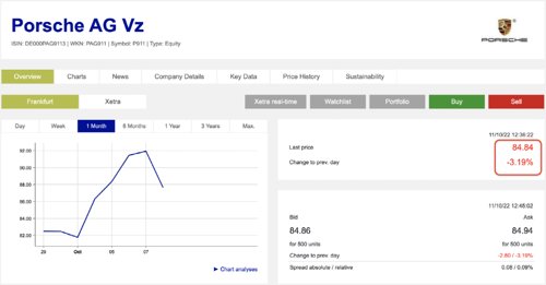 9月29日,保时捷以82.5欧元的发行价于法兰克福交易所上市,为德国有史以来第二大IPO、欧洲史上第三大IPO。为纪念经典车型911,保时捷上市的股票代码为“P911”。截至最新收盘,保时捷股价为84.84欧元,高于其发行价82.5欧元。