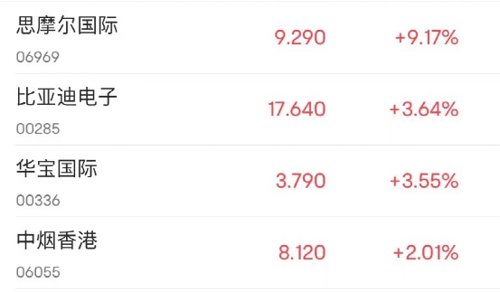 截至收盘,电子烟龙头思摩尔国际涨超9%,比亚迪电子涨3.64%,华宝国际涨超3.5%,中烟香港涨超2%。
