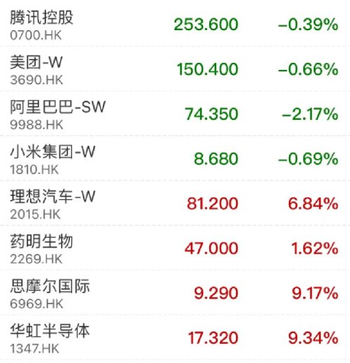 另一方面,半导体、新能源汽车股走强,华虹半导体涨超9%,理想汽车涨近7%;电子烟概念股上扬,龙头思摩尔国际涨超9%。