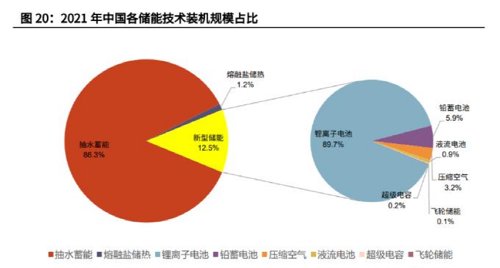 根据中关村储能数据,2021年锂离子电池占中国新型储能装机量的89.7%市场份额,是最具代表性的新型储能技术,目前广泛应用于1-2小时的中短时储能场景中,在4-8小时的储能项目中也有应用。