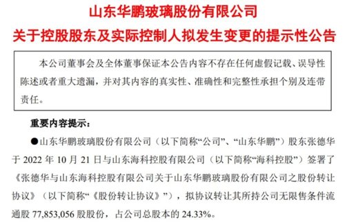 10月21日晚,市值18亿的山东华鹏公告,股东张德华与山东海科控股签署股份转让协议,拟将所持的7785万股股份转让给后者,占公司总股本的24.33%,转让价款5.52亿元,溢价率约25%。此举将导致山东华鹏控股股东和实际控制人发生变化。