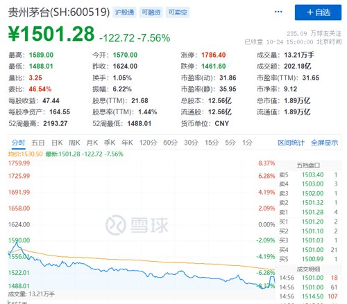 贵州茅台一度跌破1500元大关,一股茅台一瓶酒。白酒股盘中大幅下挫。