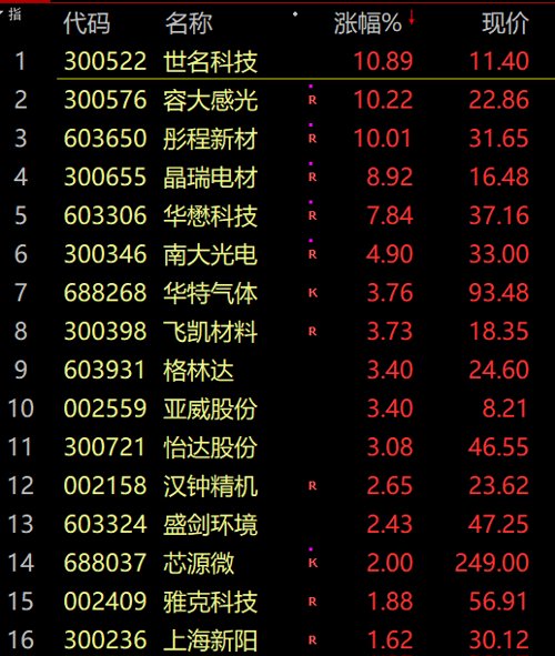 有分析指出,国庆节后白酒板块持续承压,10月来申万白酒指数下跌逾12%,其中贵州茅台下跌超13%,市场对白酒预期骤降,源自三方面:一是国庆期间疫情多点散发,旺季预期落空,节后经销商库存及现金流压力有所提升,且淡季茅台批价有所回落压制,加之明年春节较早,部分投资者对12月开始的春节回款产生担忧;二是节后禁酒令预期发酵,导致板块短期避险情绪加重;三是受美元加息预期影响,外资近期流出较快。华创证券指,10月来白酒板块大幅回落源自三方面:一是春节回款前景分歧,二是禁酒令传闻发酵,三是外资流出。市场情绪快速宣泄后,预计短线资金离场,板块已现吸引力。第一,当前各地疫情政策趋于常态化,需求弱复苏方向不变;第二,关于禁酒令的预期;第三,核心酒企标的估值快速回落,其中茅台对应23年30倍PE,五粮液21倍PE,当前业绩和估值匹配度已具吸引力。总体而言,在淡季缺乏催化剂,且市场担忧快速反映之后,预计短线资金已离场,板块已现吸引力。医药股持续走弱,片仔癀等多股跌停,片仔癀、赛隆药业、黄山胶囊、卫信康、双成药业、万方发展等跌停。 受国内光刻胶需求快速提升消息影响,光刻胶概念爆发,彤程新材涨停,容大感光涨超10%,南大光电、晶瑞电材、飞凯材料、强力新材等纷纷冲高。海通证券发布研究报告称,下游需求国内光刻胶市场规模持续扩大,半导体用光刻胶加速实现进口替代。光刻胶生产工艺复杂,技术壁垒较高,高端光刻胶仍日韩垄断,进口替代是趋势所向,国内企业已在高端光刻胶进口替代上取得突破,进口替代趋势愈加明显。