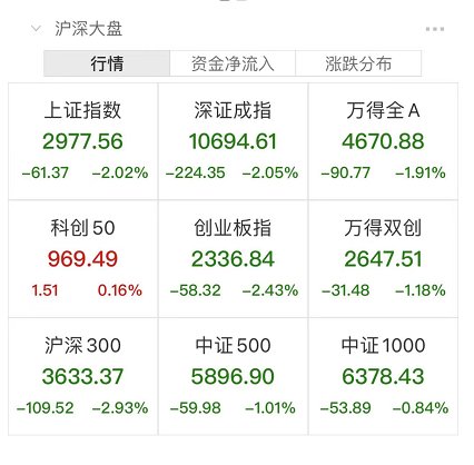 两市超3800股飘绿,今日成交8810亿元。截至收盘沪指跌2.02%,深成指跌2.05%,创业板指跌2.43%。