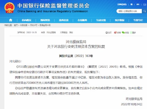 银保监会官网公布的最新批复信息显示,河北银保监局同意河北银行变更注册资本方案,增发股份数量不超过10亿股,增发对象为非自然人股东,批复时间为10月24日。股份增发后,河北银行注册资本由70亿元增至不超过80亿元。