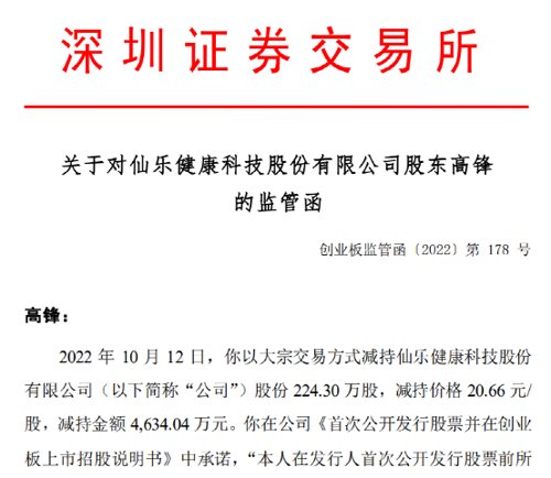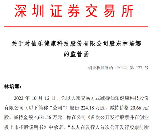 据深交所下发的监管函披露,2022年10月12日,林培娜以大宗交易方式减持仙乐健康股份224.18万股,减持价格20.66元/股,减持金额4631.56万元。