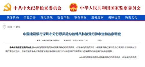 今年4月22日,据中央纪委国家监委网站通报,中国建设银行深圳市分行原风险总监韩凤林涉嫌严重违纪违法,接受中央纪委国家监委驻中国建设银行纪检监察组纪律审查和山东省青岛市监察委员会监察调查。