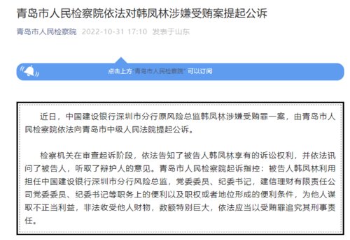 10月31日,青岛市人民检察院消息,近日中国建设银行深圳市分行原风险总监韩凤林涉嫌受贿罪一案,由青岛市人民检察院依法向青岛市中级人民法院提起公诉。