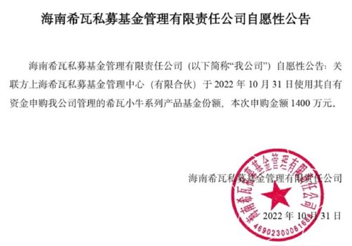 10月31日,百亿股票私募海南希瓦私募基金也发布自愿性公告,公司表示,关联方上海希瓦私募基金管理中心(有限合伙)于2022年10月31日使用其自有资金申购公司管理的希瓦小牛系列产品基金份额,本次申购金额1400万元。