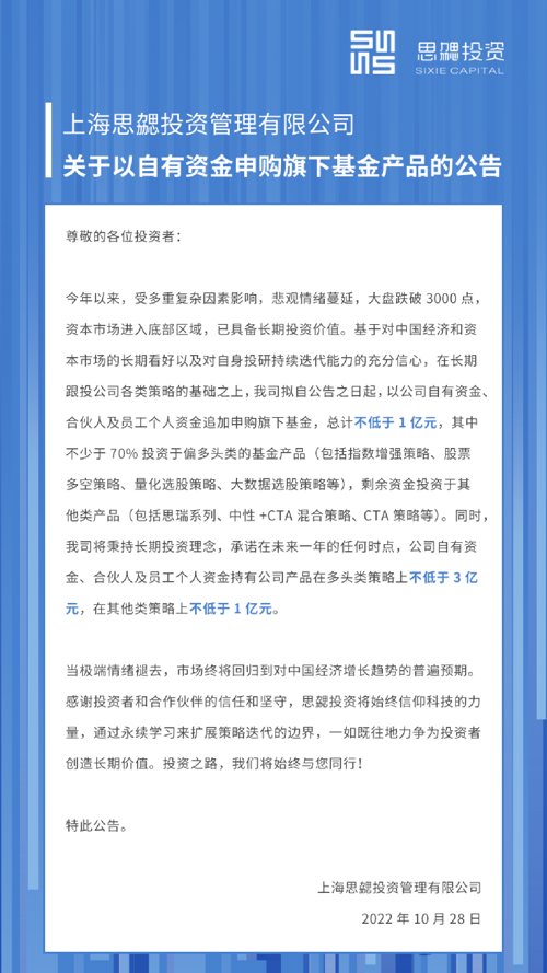 10月28日,百亿量化私募思勰投资发布《关于以自有资金申购旗下基金产品的公告》。