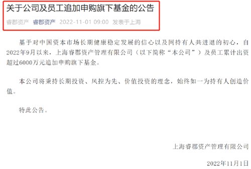 11月1日上午,沪上百亿私募机构睿郡资产发布了《关于公司及员工追加申购旗下基金的公告》,基于对中国资本市场长期健康稳定发展的信心以及同持有人共进退的初心,自2022年9月以来,上海睿郡资产管理有限公司及员工累计出资超过6000万元追加申购旗下基金。