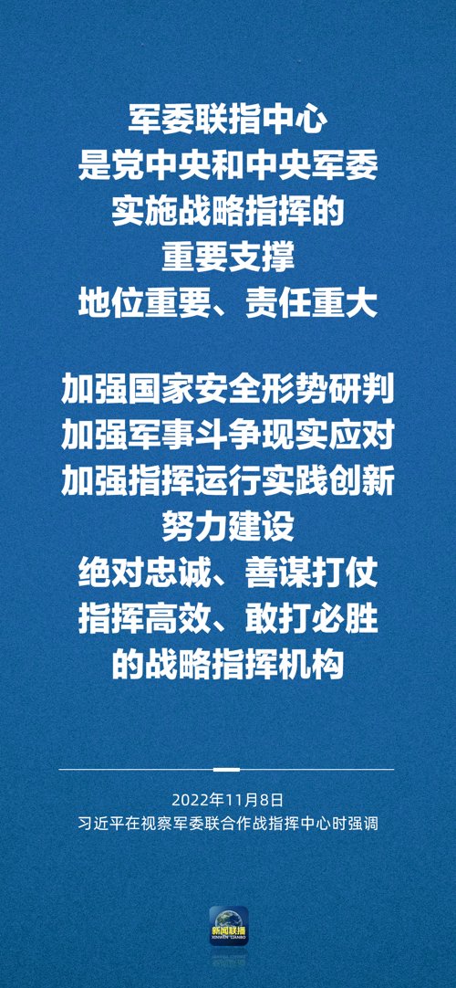 习近平指出,军委联指中心是党中央和中央军委实施战略指挥的重要支撑,地位重要、责任重大。要牢记职责使命,加强国家安全形势研判,加强军事斗争现实应对,加强指挥运行实践创新,努力建设绝对忠诚、善谋打仗、指挥高效、敢打必胜的战略指挥机构,为全面加强练兵备战、有效履行新时代我军使命任务作出新的更大贡献。