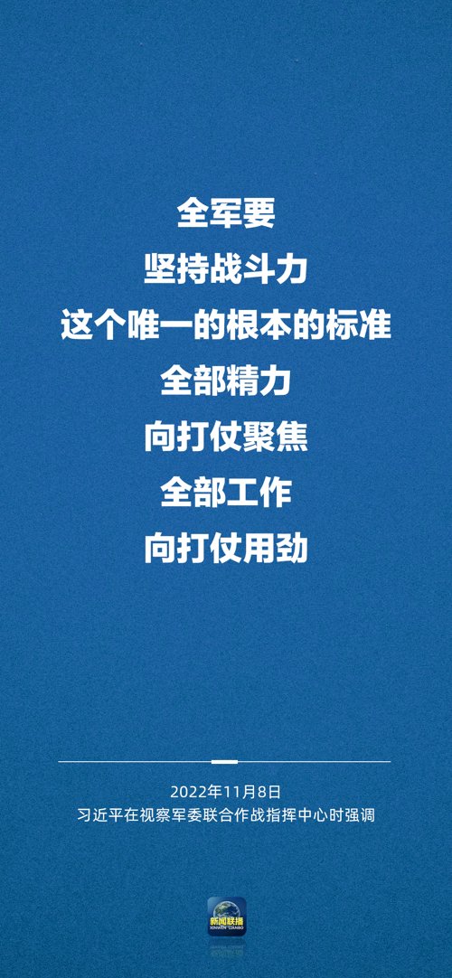 中共中央总书记、国家主席、中央军委主席、军委联指总指挥习近平8日视察军委联合作战指挥中心,表明新一届军委贯彻落实党的二十大精神、全面加强练兵备战的鲜明态度。他强调,全军要全部精力向打仗聚焦,全部工作向打仗用劲,加快提高打赢能力,有效履行新时代我军使命任务。