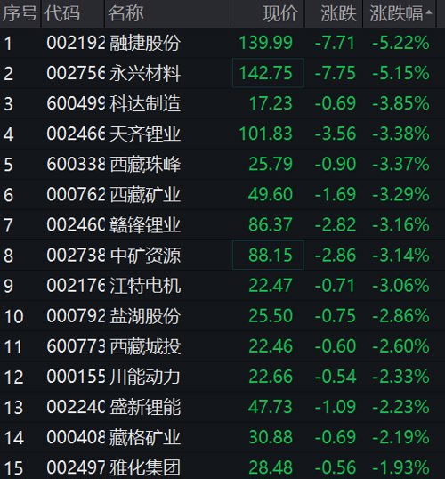锂矿板块集体回调,融捷股份跌超6%,永兴材料挫逾5%,科达制造、中矿资源、天齐锂业、西藏珠峰均跌超3%。