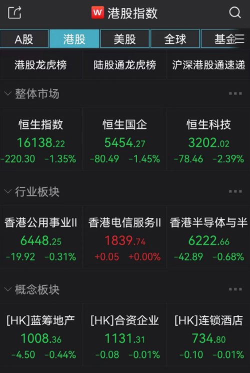 港股市场,恒指低开1.35%,恒生科技指数跌2.39%。科技、汽车股跌幅居前。舜宇光学科技跌超6%领跌蓝筹;腾讯、阿里巴巴跌超3%。