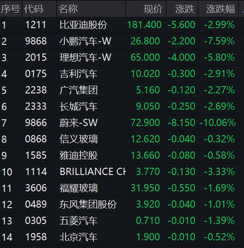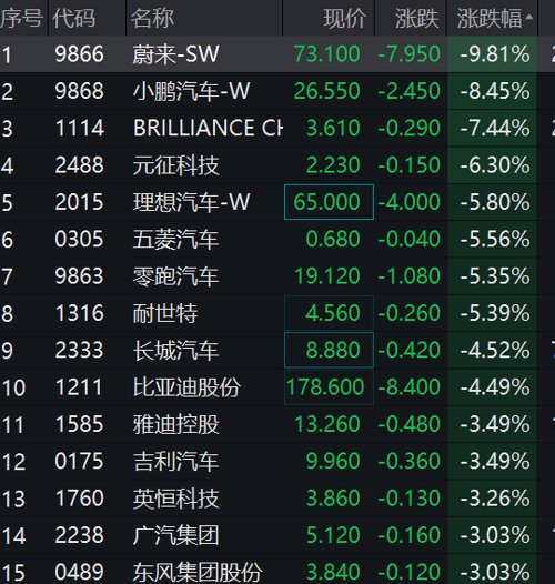 港股新能源汽车继续领跌,蔚来大跌超10%,小鹏跌近8%,理想跌近6%。