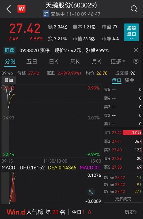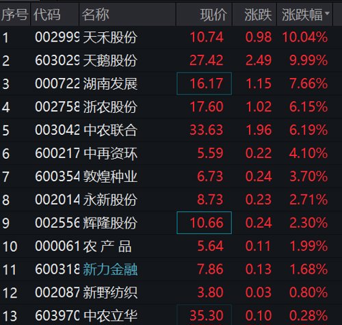 个股方面,天禾股份开盘一字涨停,天鹅股份盘初再度缩量触及涨停,录得9连板。湖南发展、浙农股份、中农联合涨超6%。