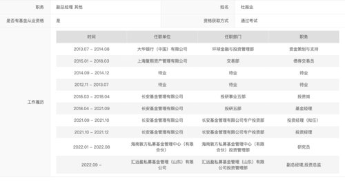 去年年底,杜振业正式从长安基金离职。备案信息显示,杜振业先是在今年1月加入了海南敦方私募基金管理中心(有限合伙)担任研究员,9月自主创业,正式出任汇远盈私募基金的副总经理和投资总监。