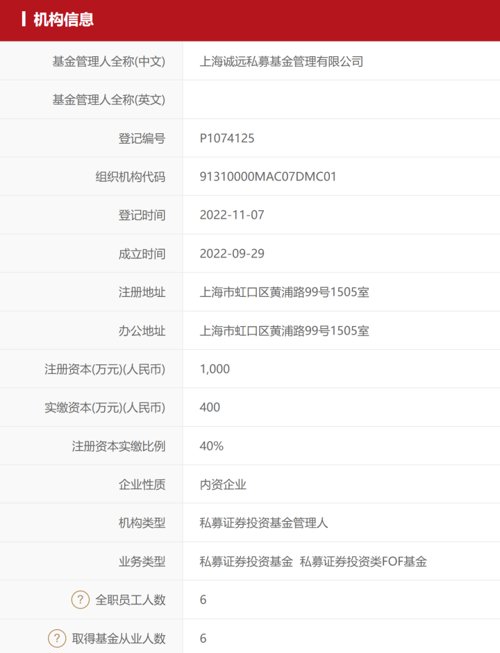 “上海诚远私募基金管理有限公司”(以下简称“上海诚远私募基金”)成立于2022年9月29日,注册资本1000万,实缴400万;公司在今年11月7日在基金业协会完成私募基金管理人备案登记,机构类型是私募证券投资基金管理人 ,目前注册和办公地都在上海市虹口区。