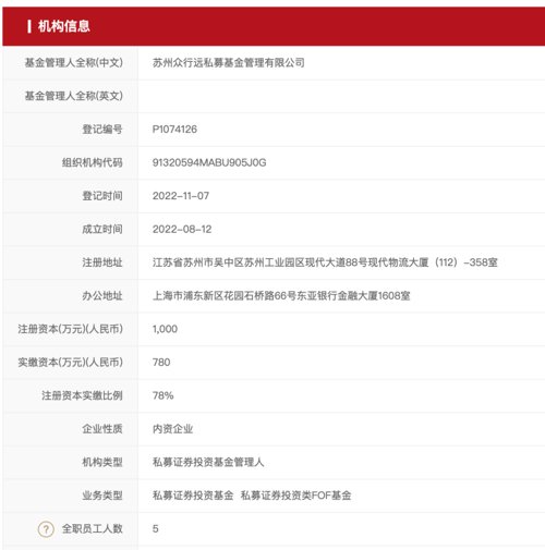 与汇远盈私募基金、上海诚远私募基金一起完成备案的,还有一家名为“苏州众行远私募基金管理有限公司”(以下简称“苏州众行远私募基金”),这家新锐私募成立于2022年8月12日,注册资本1000万元;公司备案登记于2022年11月7日,机构类型是私募证券投资基金管理人,注册地在江苏省苏州市吴中区,办公地在上海市浦东新区。