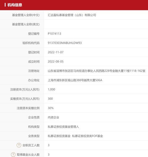 11月7日,基金业协会信息显示,汇远盈私募基金管理(山东)有限公司(以下简称“汇远盈私募基金”)完成私募证券投资基金管理人备案登记,注册地在山东省淄博市,办公地址在上海市浦东新区。这家公司成立于2022年8月5日,注册资本1000万,实缴300万。