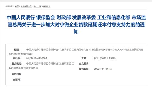 为进一步加大对小微企业等市场主体支持力度,深入落实好稳经济一揽子政策和接续政策,助力稳住经济大盘,近日,人民银行、银保监会、财政部、发展改革委、工业和信息化部、市场监管总局等六部门联合印发《关于进一步加大对小微企业贷款延期还本付息支持力度的通知》(以下简称《通知》),对于2022年第四季度到期的小微企业贷款,鼓励银行业金融机构按市场化原则与企业共同协商延期还本付息。《通知》明确,对于2022年第四季度到期的、因新冠肺炎疫情影响暂时遇困的小微企业贷款(含个体工商户和小微企业主经营性贷款),还本付息日期原则上最长可延至2023年6月30日。延期贷款正常计息,免收罚息。各银行业金融机构要坚持实质性风险判断,及时调整信贷管理系统,不单独因疫情因素下调贷款风险分类,不影响征信记录,并完善贷款延期还本付息相关尽职免责规定。银行业金融机构要创新延期贷款产品和服务,强化金融科技赋能,提前对接企业延期需求,为企业提供差异化贷款延期方式、线上续贷产品和贷款延期线上办理渠道。在有效防控风险的前提下,对于缺乏部分材料的贷款延期申请可“容缺办理”,事后补齐。同时,银行业金融机构要加大政策宣传解读力度,及时公示办理条件、所需材料、办理流程及办理时限,提高小微企业办理贷款延期的便利度。为充分调动银行业金融机构的积极性,《通知》提出,人民银行综合运用多种货币政策工具,保持银行体系流动性合理充裕;金融监管部门落实好小微企业不良贷款容忍度等差异化政策;各级财政部门在考核国有控股和参股的银行业金融机构2022年经营绩效时,应充分考虑延期还本付息政策的影响,给予合理调整和评价。同时,鼓励政府性融资担保机构对有贷款延期需求的企业延长担保期限,继续提供增信支持。下一步,人民银行等六部门将深入学习贯彻党的二十大精神,加强政策协同,畅通政策传导渠道,推动银行业金融机构加快落实《通知》要求,并强化政策实施效果跟踪监测,确保政策取得实效。http://www.pbc.gov.cn/zhengwugongkai/4081330/4406346/4693549/4710683/index.html除了央行,银保监会也给地产送温暖了。将允许房地产开发商获得部分预售资金!