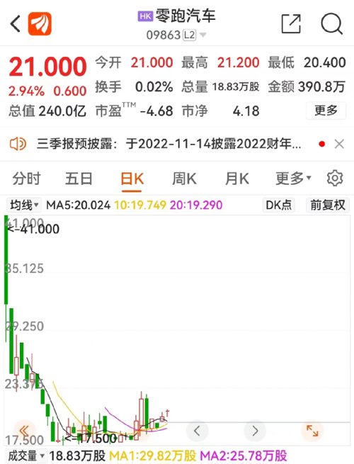 在经营方面,零跑汽车面临着巨大压力,而在二级市场,其股价也在9月29日上市以来一直承压。截止11月14日收盘,零跑汽车收报21港元/股,较其上市发行价48港元/股已经下跌56.25%,目前总市值约240亿港元。