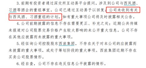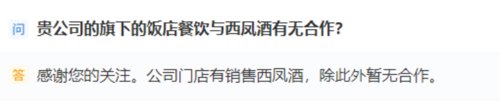 其实,早在8月30日就有投资者在互动易询问,公司旗下饭店是否与西凤酒有合作。当时董秘便回复称,“公司门店有销售西凤酒,除此之外暂无合作。”