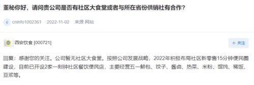 对于近期大火的供销社概念,西安饮食也亲自下场辟谣。有投资者问,“公司是否有社区大食堂或者与所在省份供销社有合作?”