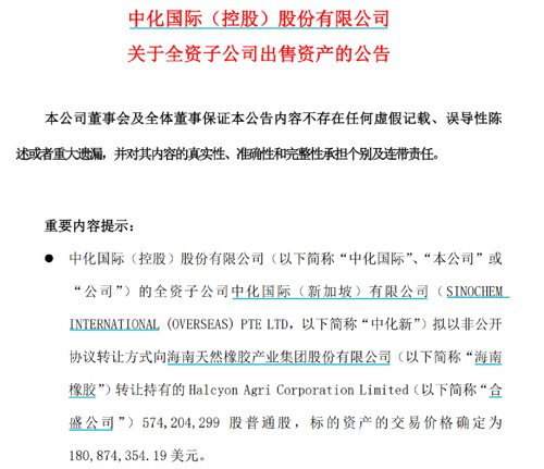 据了解,中化国际一直以来力图由传统贸易业务向精细化工生产型平台转型。其全资子公司中化国际(新加坡)有限公司(中化新)拟向海南橡胶方面转让持有的Halcyon Agri Corporation Limited(合盛公司)5.74亿股,约占其已发行且实缴股本的36%。