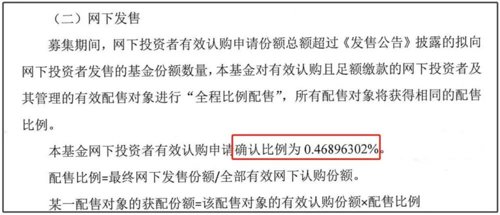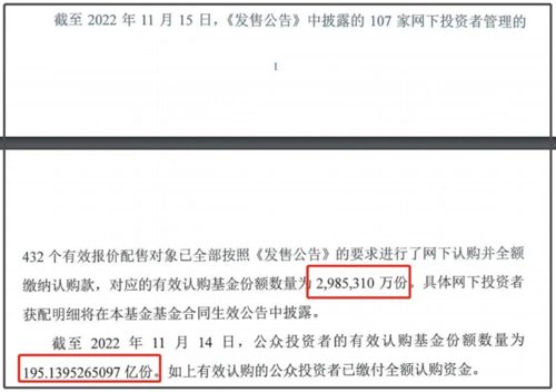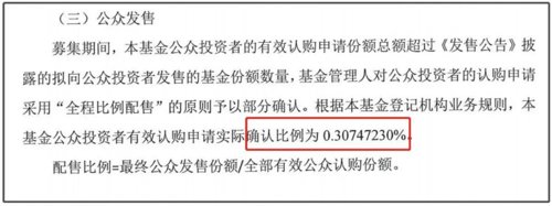 公众发售部分也是获得踊跃认购。公告显示,公众投资者的有效认购基金份额数量为195.14亿份,为公众发售初始基金份额数量0.6亿份的325.23倍,公众投资者有效认购申请实际确认比例为0.31%。按照发售价格计算,基金公众发售部分比例配售前募集规模约为471.65亿元。