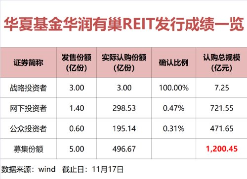 11月16日晚间,上交所官网发布公告称,华夏基金华润有巢REIT认购申请确认比例结果出炉。在该只基金募集期间,各类投资者踊跃认购:其中网下有效认购申请确认比例0.47%,刷新公募REITs网下发售配售比例新低。按照网下询价价格测算,该只产品战略配售、网下配售和公众配售部分比例配售前累计吸金超1200亿元,再度成为公募REITs的爆款品种。