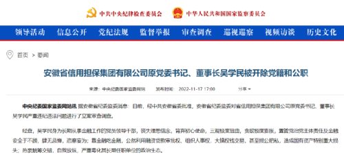 11月17日,中央纪委国家监委网站通报,安徽省信用担保集团有限公司原党委书记、董事长吴学民被开除党籍和公职。通报显示,吴学民身为长期从事金融工作的党员领导干部,“三观极度扭曲,贪欲极度膨胀”、“靠金融吃金融”、“热衷觥筹交错”,构成严重职务违法并涉嫌受贿犯罪、国有公司人员滥用职权犯罪。