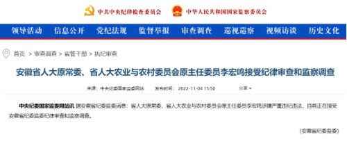 11月5日,中央纪委国家监委网站显示,据安徽省纪委监委消息:省人大原常委、省人大农业与农村委员会原主任委员李宏鸣涉嫌严重违纪违法,接受安徽省纪委监委纪律审查和监察调查。