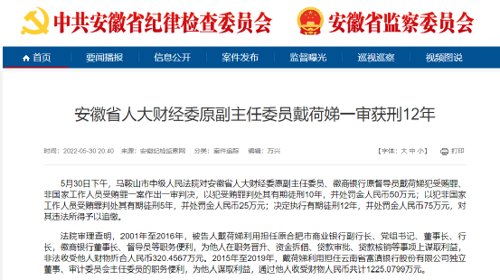 今年5月,马鞍山市中级人民法院对安徽省人大财经委原副主任委员、徽商银行原督导员戴荷娣犯受贿罪、非国家工作人员受贿罪一案作出一审判决,决定执行有期徒刑12年,并处罚金75万元,对其违法所得予以追缴。