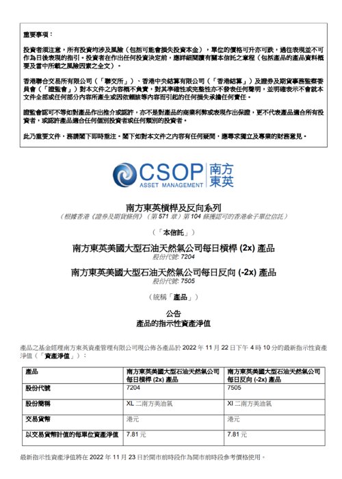 11月22日,南方东英资产管理有限公司(以下简称“南方东英”)发布公告表示,南方东英美国大型石油天然气公司每日杠杆(2x)产品(7204.HK)和南方东英美国大型石油天然气公司每日反向(-2x)产品(7505.HK)将于2022年11月23日在香港交易所上市。