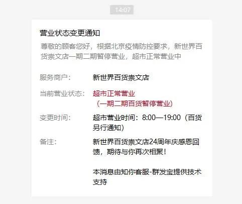 据新世界百货北京崇文店微信公众号消息,新世界百货崇文店一期二期暂停营业,超市正常营业。