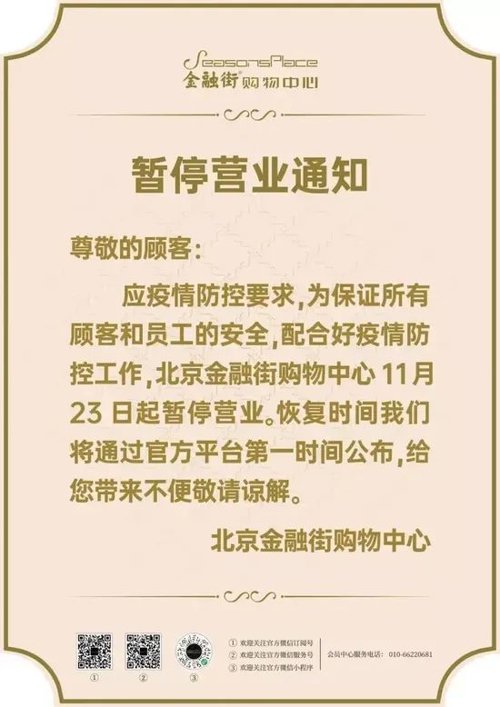 23日,作为北京西边的高级购物中心代表,金融街购物中心宣布从11月23日起暂停营业。